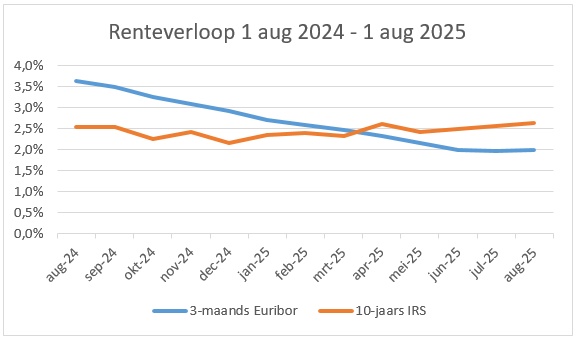 De tarieven op de geldmarkt (kortlopende leningen) volgen de tarieven die de ECB hanteert met haar depositorente. Na enkele jaren van stijgingen is dit tarief in stappen van een kwart procentpunt verlaagd tot 2% op dit moment. De verwachting is dat er nog 0 tot 2 rentestappen van een kwart procentpunt zullen volgen dit jaar waardoor het tarief per ultimo 2025 tussen de 1,50% en 2% zal uitkomen.